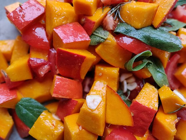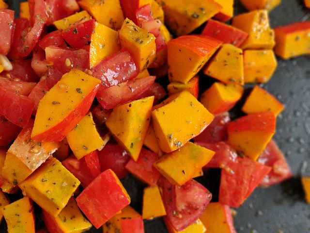 - Anschließend Hokaido und Tomaten in Würfel schneiden und in eine Schüssel geben.