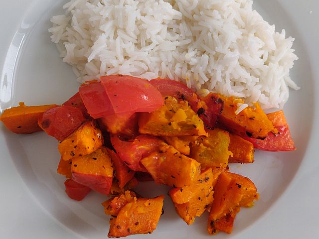 Hokaido gebacken mit Knoblauch-Tomaten und Basmati-Reis. Fertig nach etwa 30 Minuten. 😉